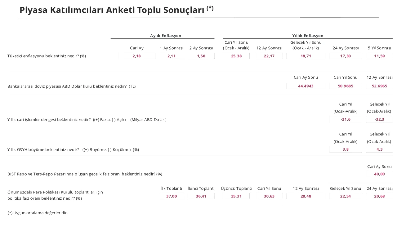 Piyasa Katılımcıları Anketi’ne göre, mevcut yıl sonu için tüketici enflasyonu beklentisi yüzde 25,38’e ulaşmış durumda. 12 ay sonrası için beklenti ise yüzde 22,17’dir. 24 ay sonrası için öngörü ise yüzde 17,30 düzeyinde gerçekleşti. Katılımcılar, enflasyonun büyük olasılıkla yüzde 20,00 ile 22,99 aralığında seyredeceğini düşünüyor.